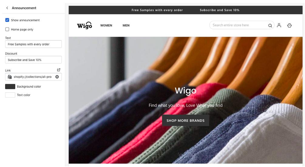 You can enable the announcement bar to show a message to your customers. Your message is completely customizable and can include contact information, a link, information about store events or sales, and your store's slogan or branding message. The announcement bar can appear on all pages of your store, but you can choose to display it on the home page only.