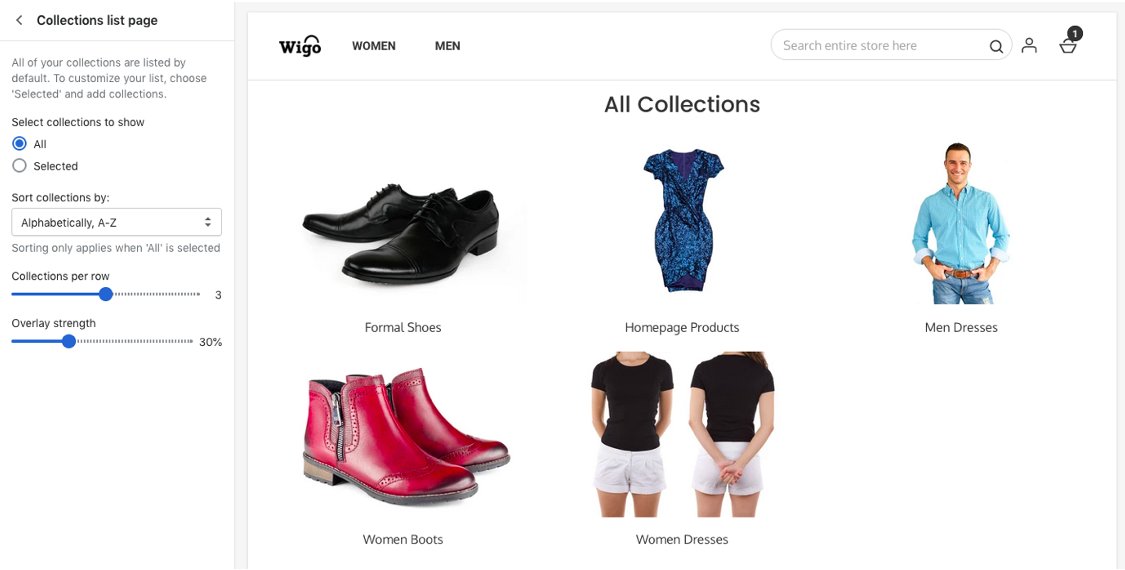 The Collection section is the main customizable section for collection pages. You can customize this section using the following options: