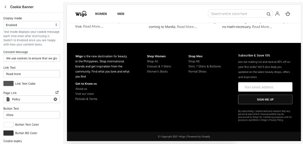 Theme’s cookie banner that appears at the bottom whenever a new user enters the store.