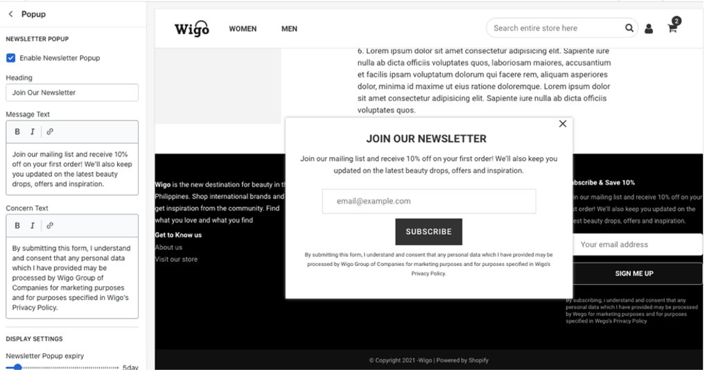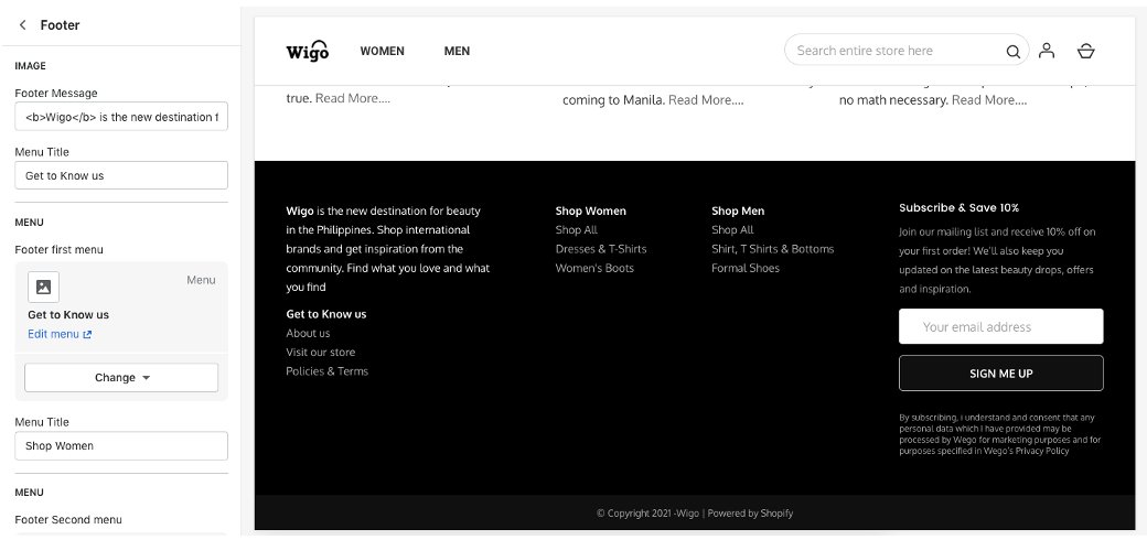 You can add a menu, newsletter signup and text section containing information about store business to your footer. This displays all of the menu's links in your footer, which you can use to highlight the common pages that your customers want to access. For example, you could add a menu that contains links to your contact and shipping policies.