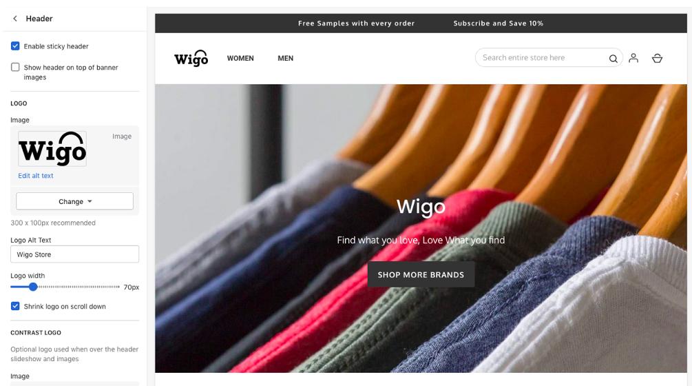 Add custom logo image to store's header. The best format is .png file with a transparent background and resize the logo image by increasing or decreasing the width